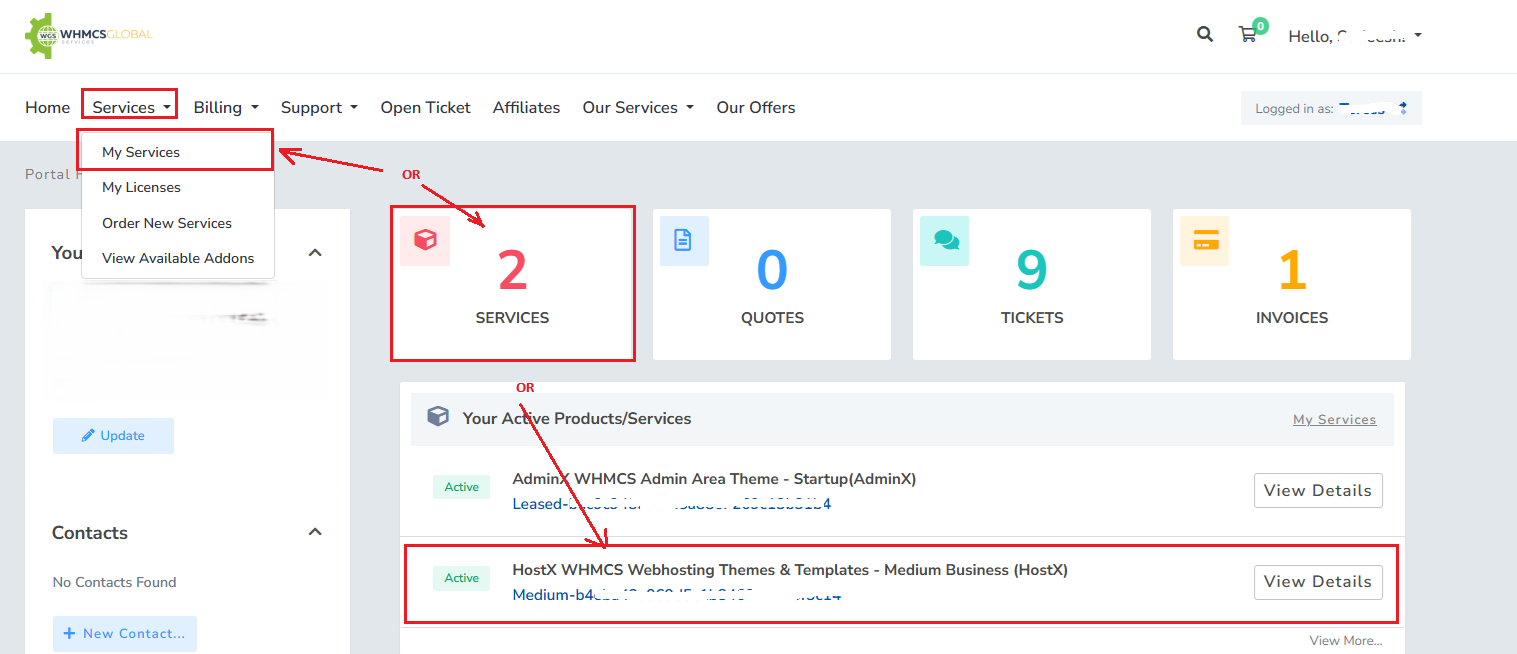 Navigate to My Services OR click the Services box Or Under Your Active Products/Services, locate the product you've purchased and click on it.