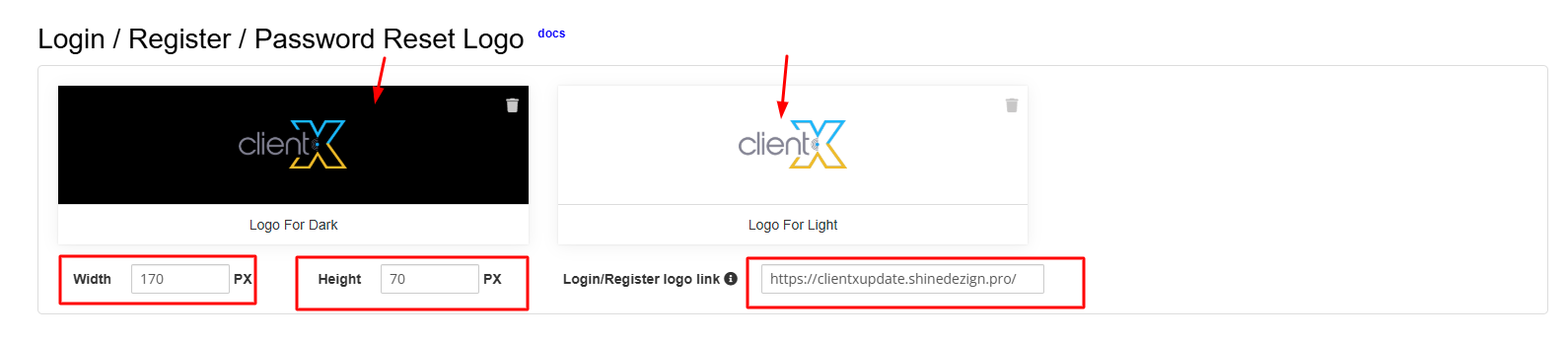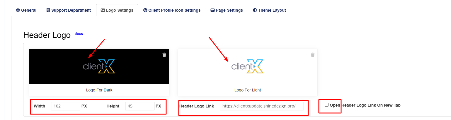 Under the Logo Settings tab, you can manage and customize all logo types used across the ClientX theme. Each section below controls a specific logo area.