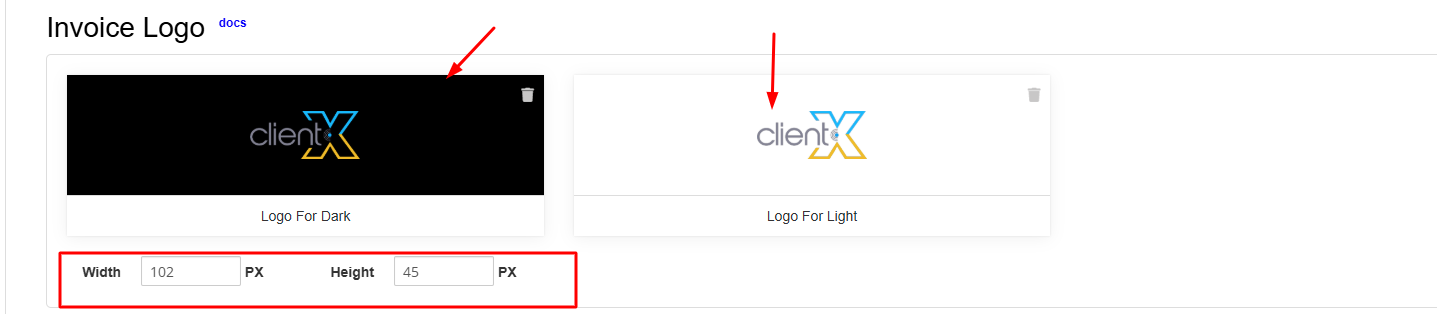 Logo – Upload the invoice logo image for both Dark and Light themes.