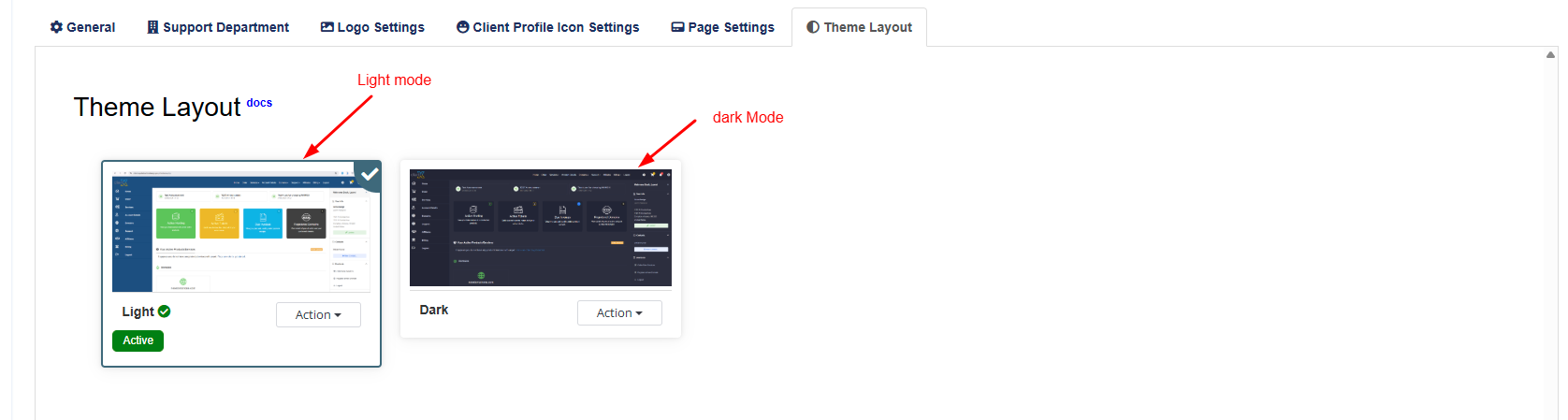 In the Theme Layout tab, select Dark Mode as the active theme.
