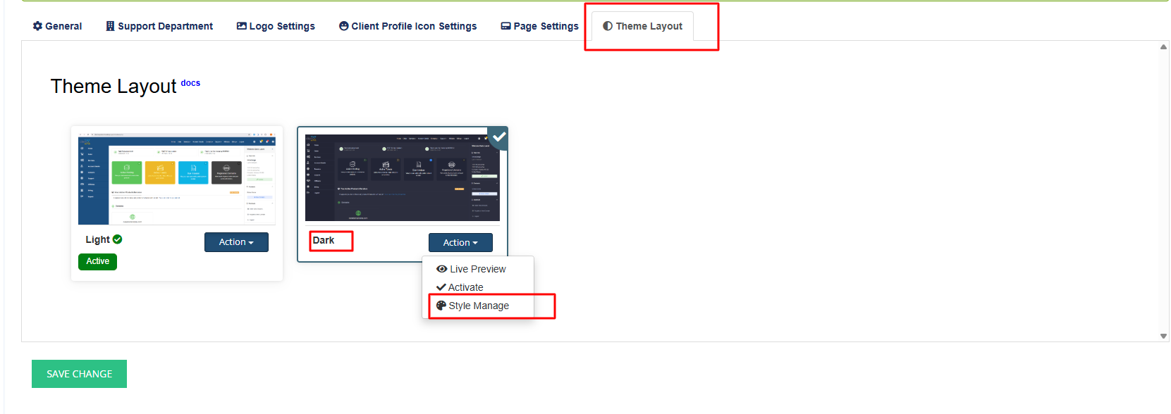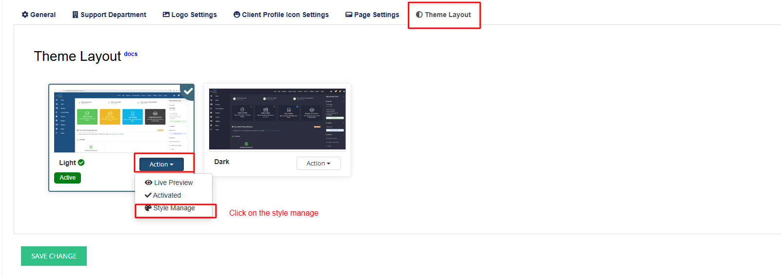 Under the Action column, click Style Manage.