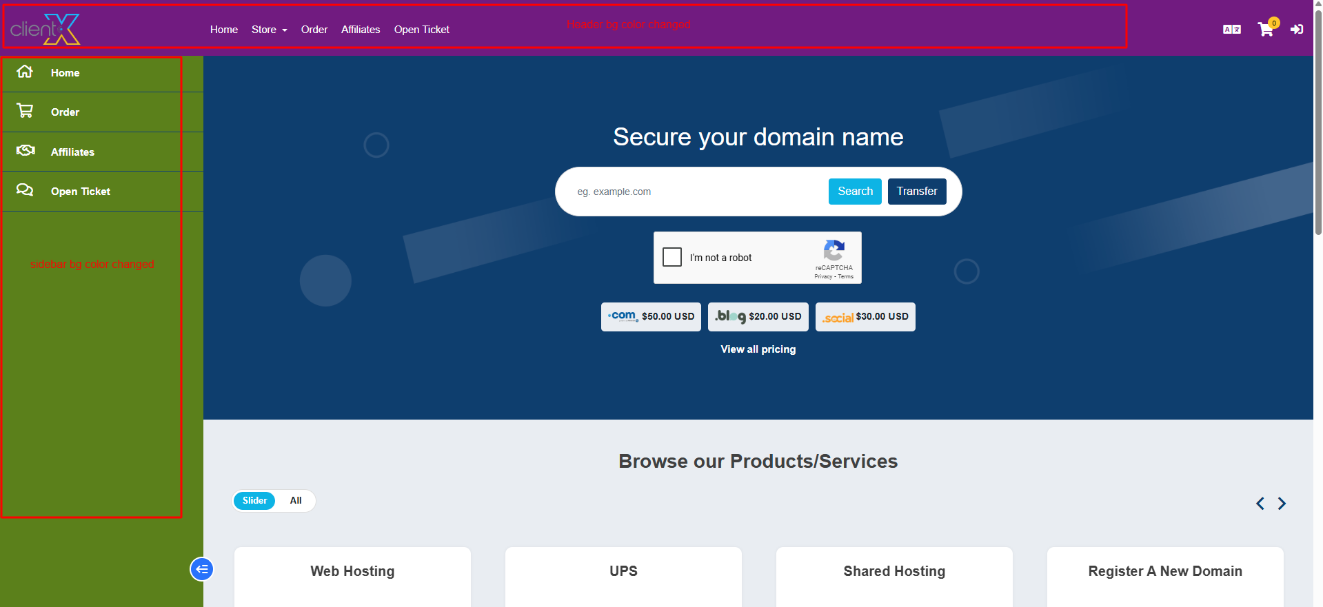The updated Light theme with custom colors will be displayed across the Client Area, as shown in the attached screenshot below.