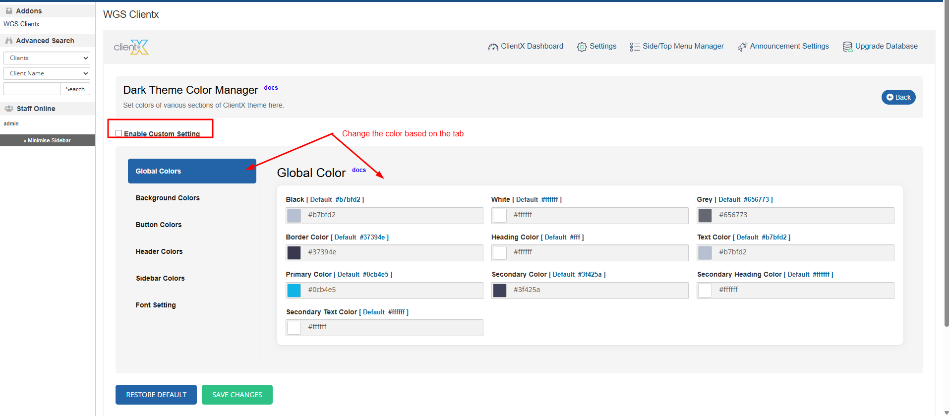 When Enable Custom Settings is disabled, the Dark theme uses the default ClientX color scheme, as shown in the attached screenshot below.