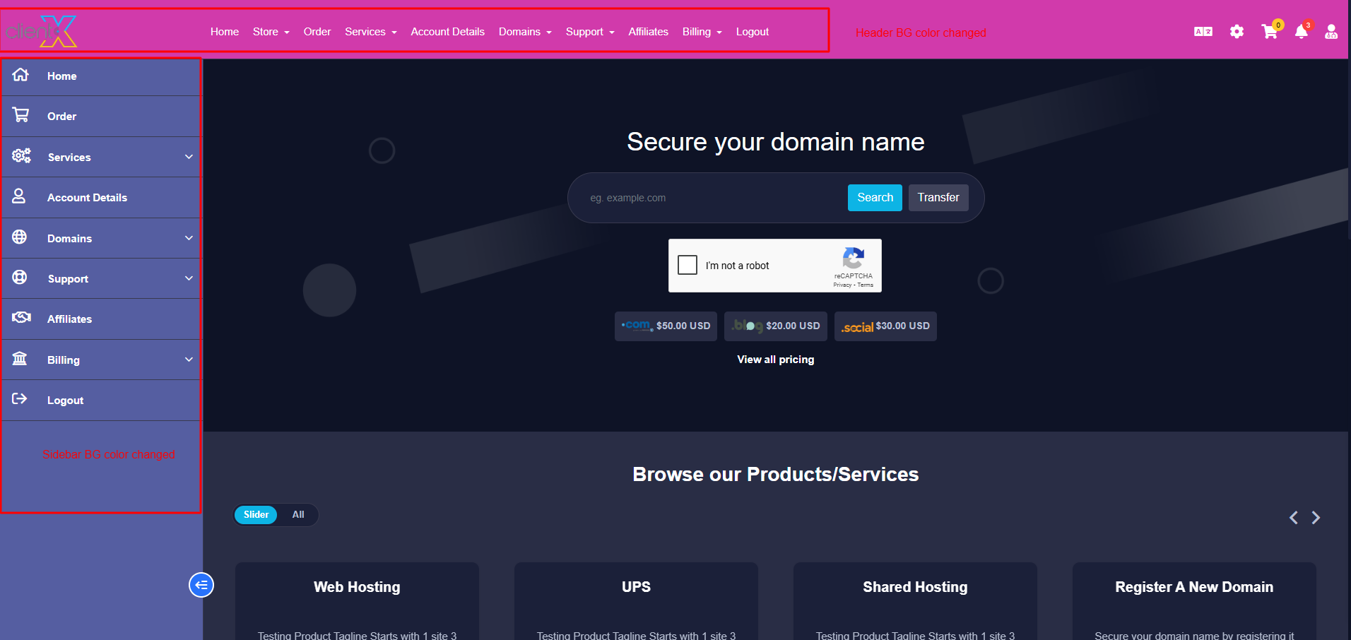 The updated Dark theme with custom colors will be displayed across the Client Area, as shown in the attached screenshot below.