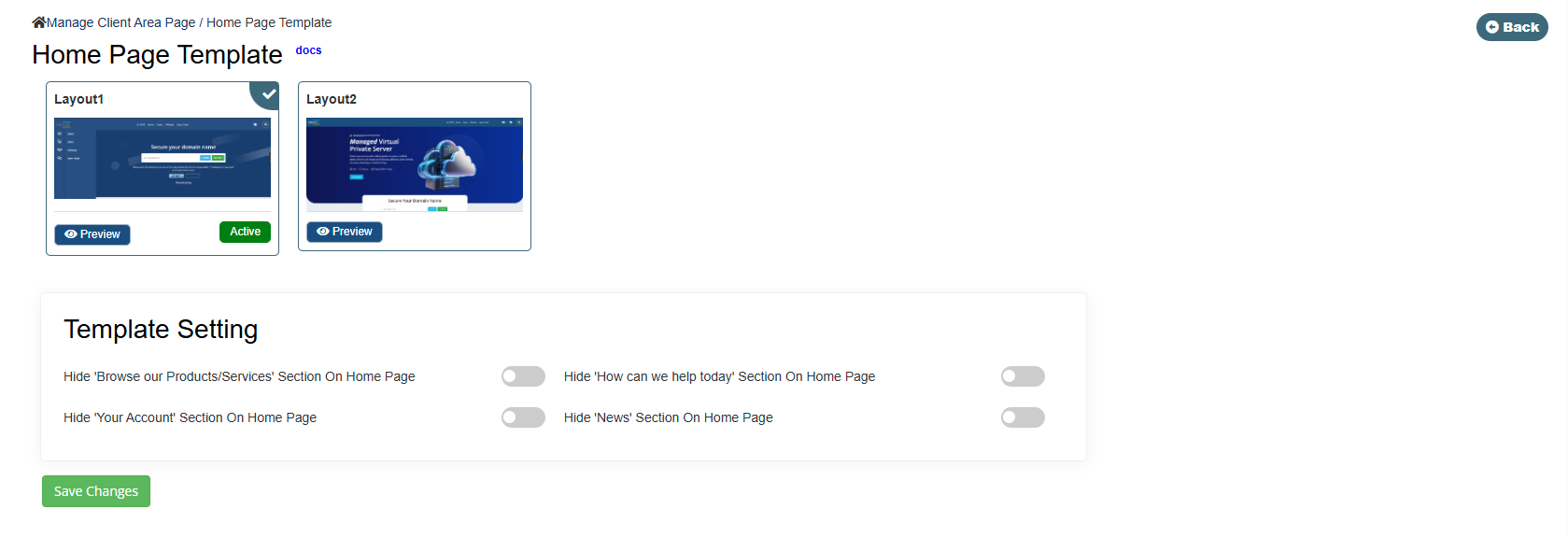 On this screen, you will find two Home page layout options: