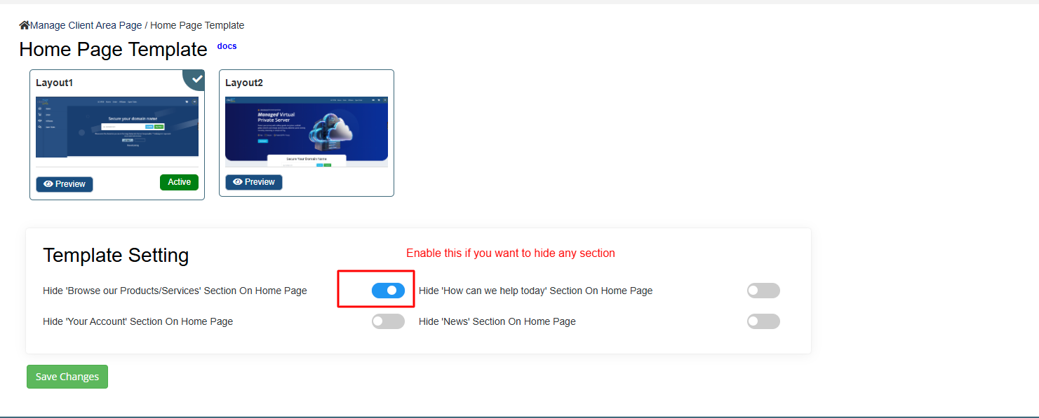 Enable or disable specific Home page sections