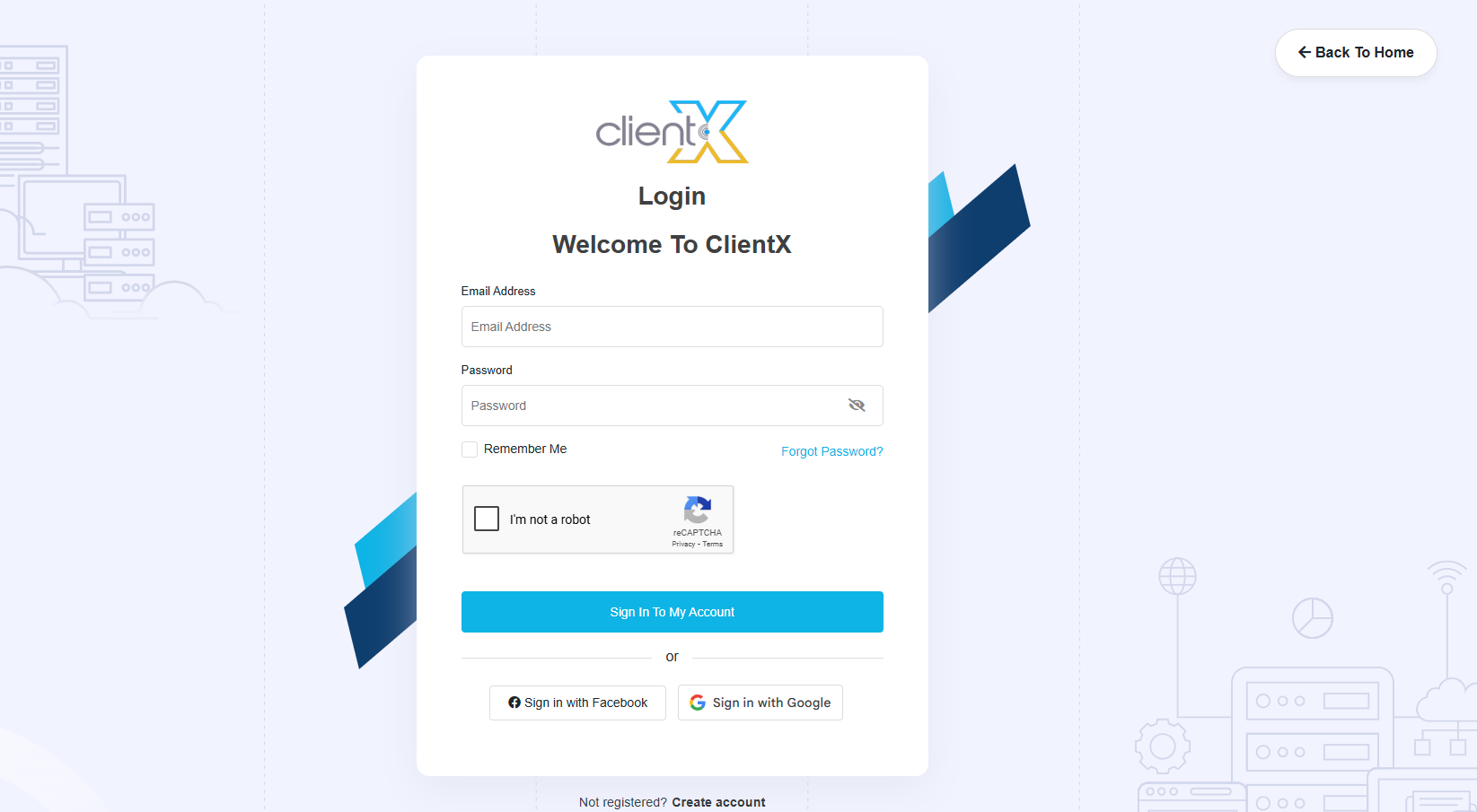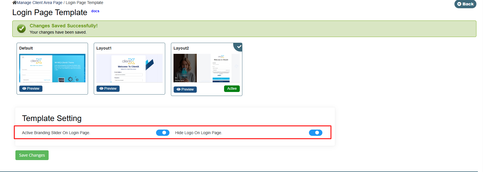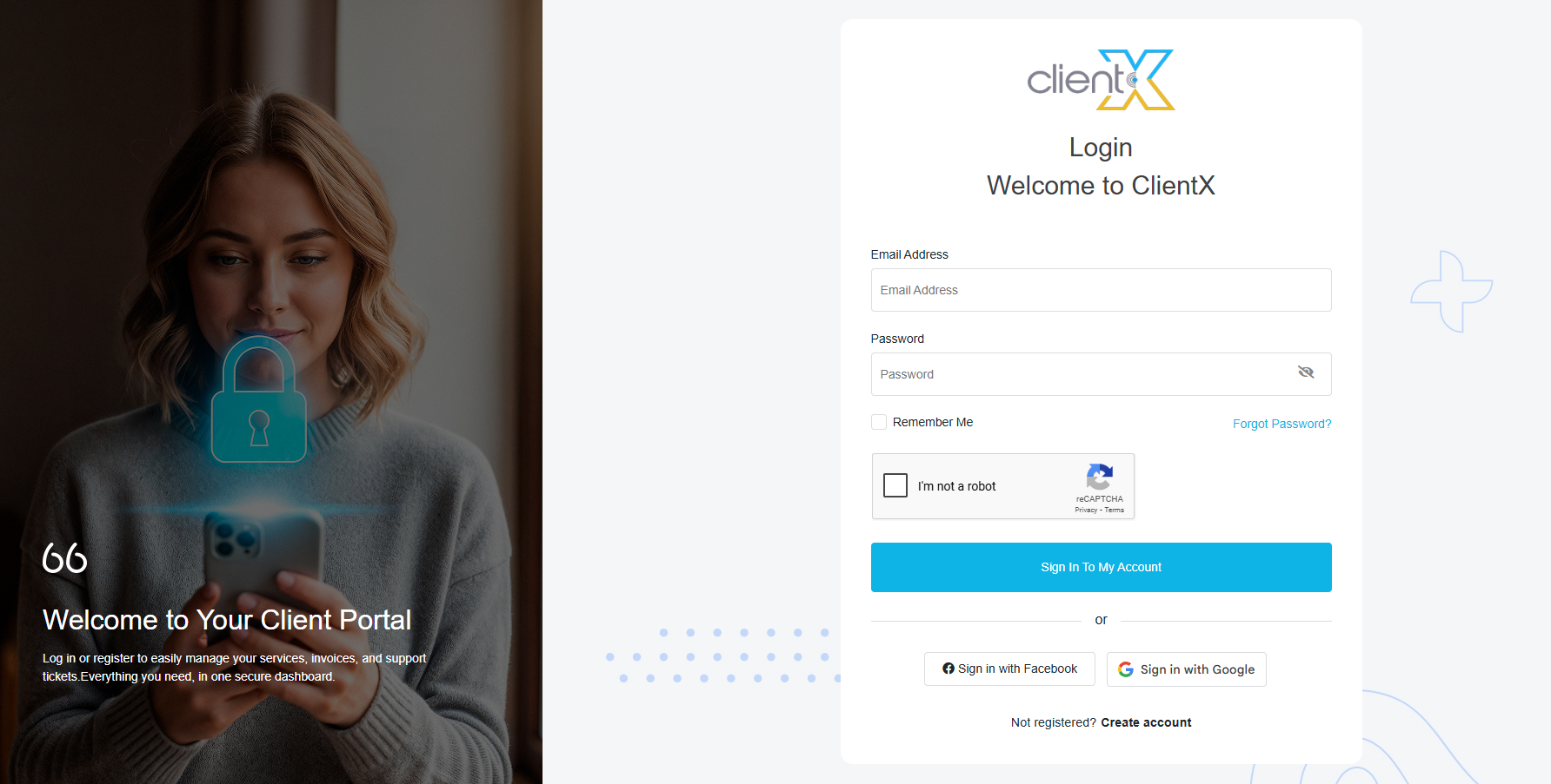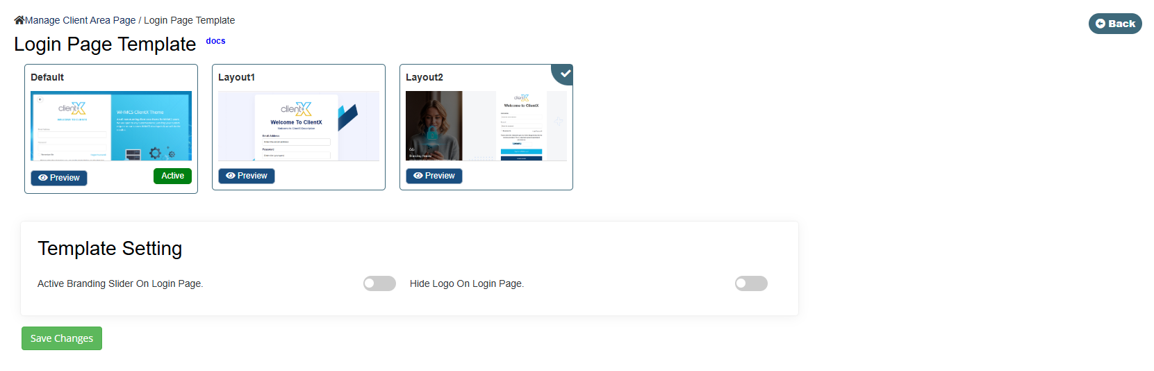 ClientX provides multiple login page layouts with optional customization settings, allowing you to control the appearance and structure of the client login experience.