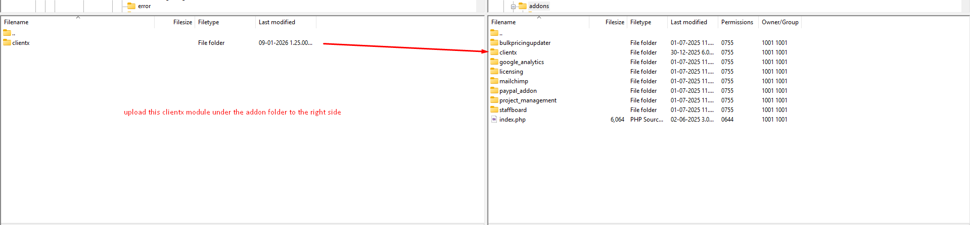 Step 15: Upload clientx folder under WHMCS setup addons folder (whmcs_root/modules/addons/).