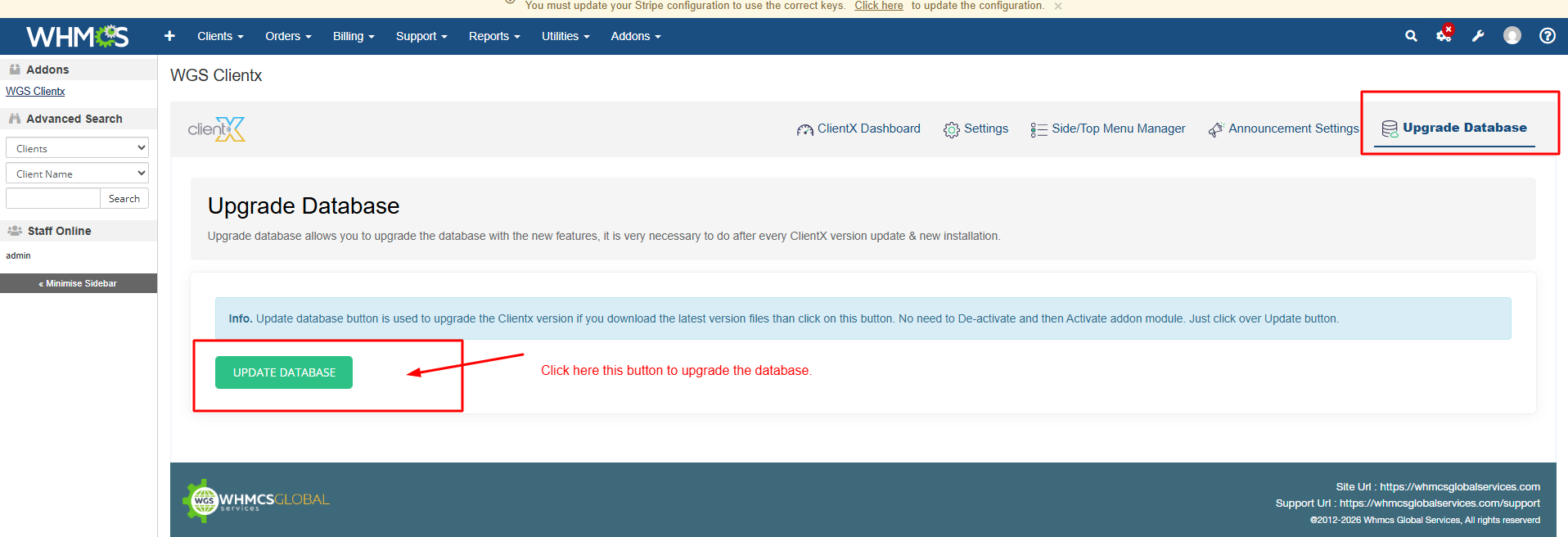 Note: It is required to upgrade the database otherwise it will show the table errors on the clientarea.
