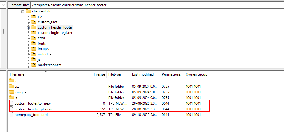 Open FTP and navigate to: /templates/clientx-child/custom_header_footer/