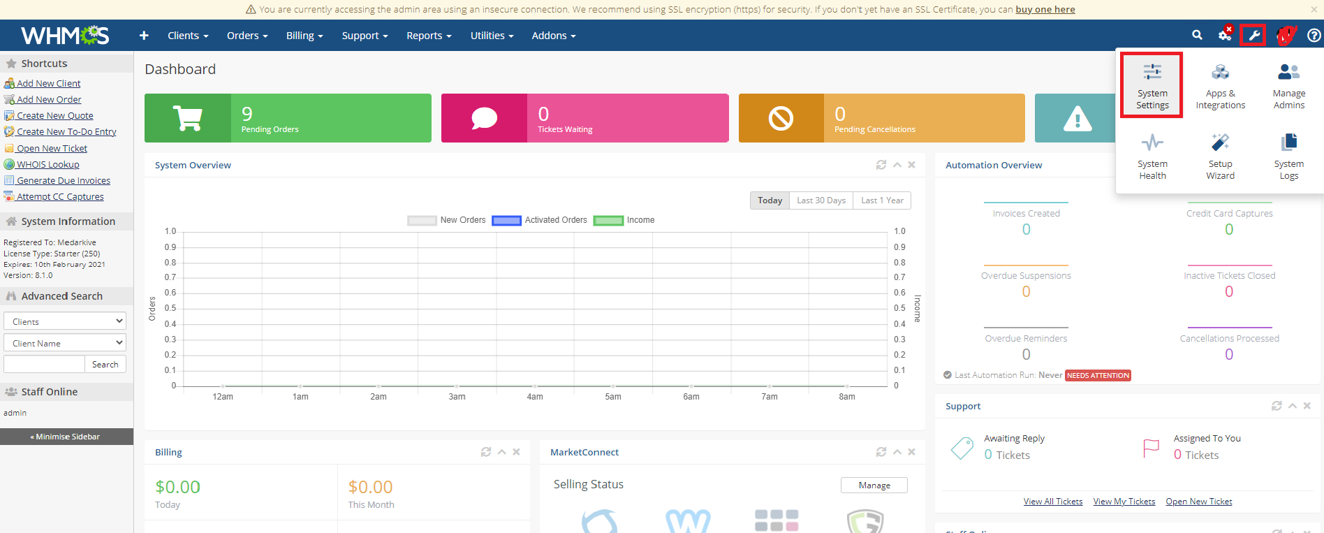 Step 6. Now open WHMCS Admin Panel and click on the Settings icon and select the System Settings option >> Addon Modules.
