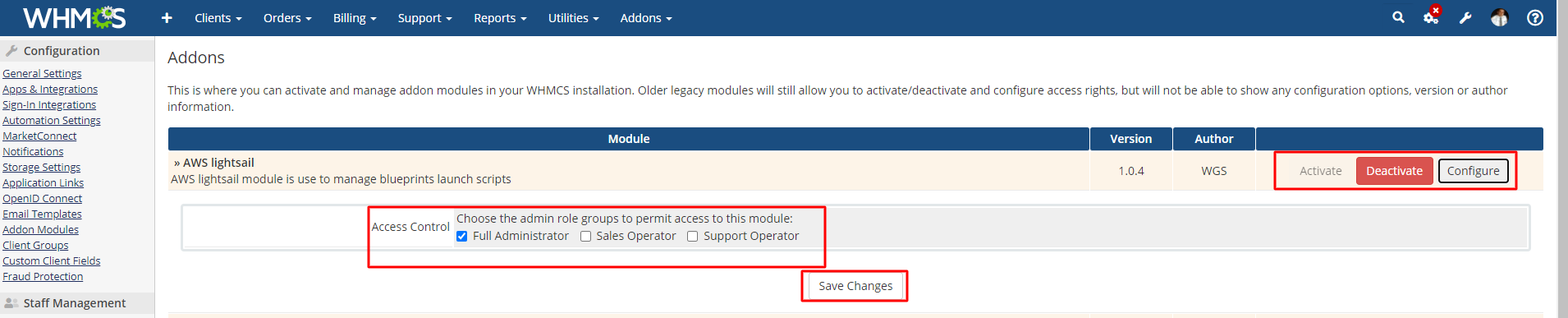 Step 8. Once done with the activation, click on the Configure button and Choose the admin role groups to permit access to this module, and Save Changes